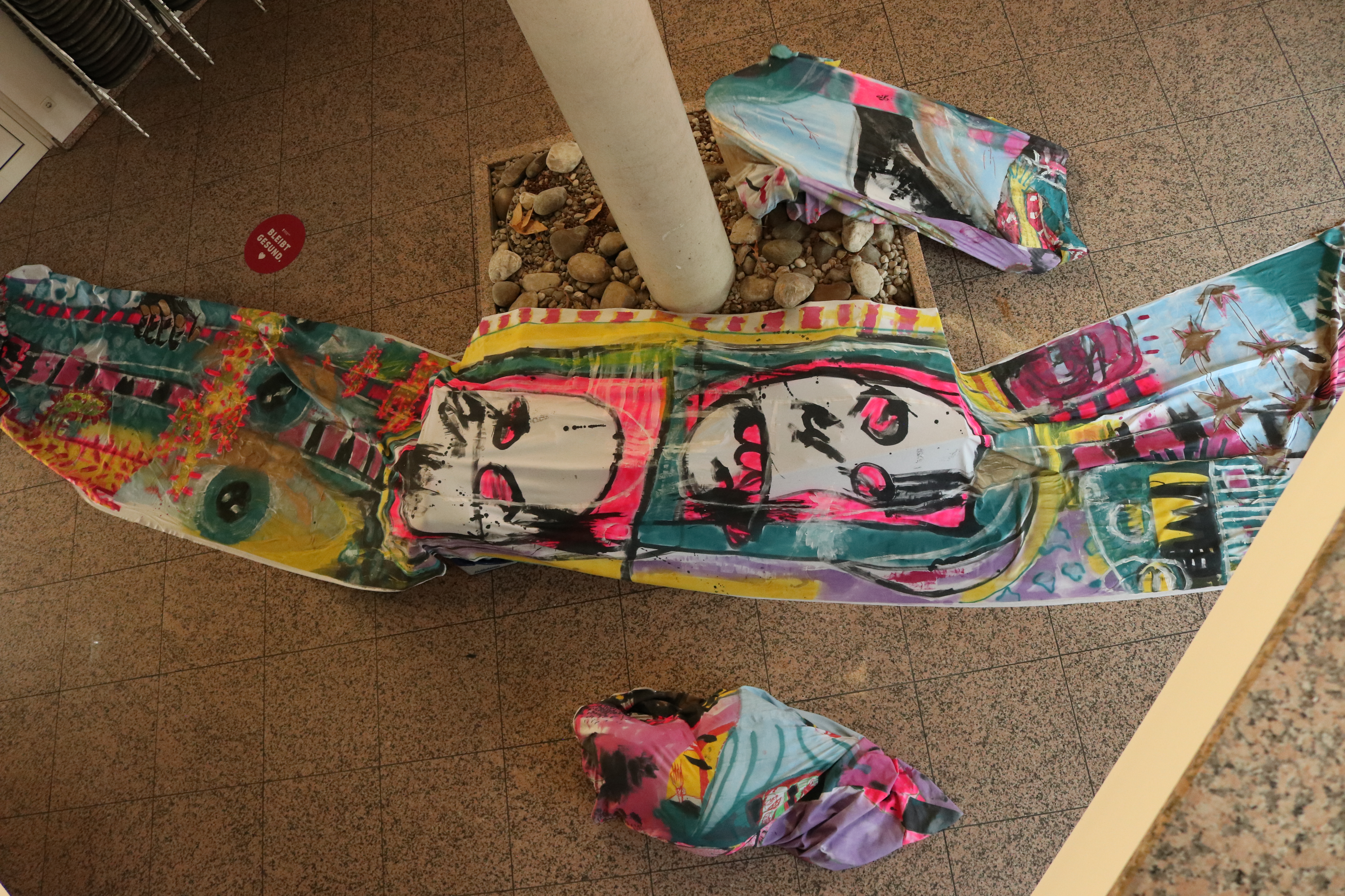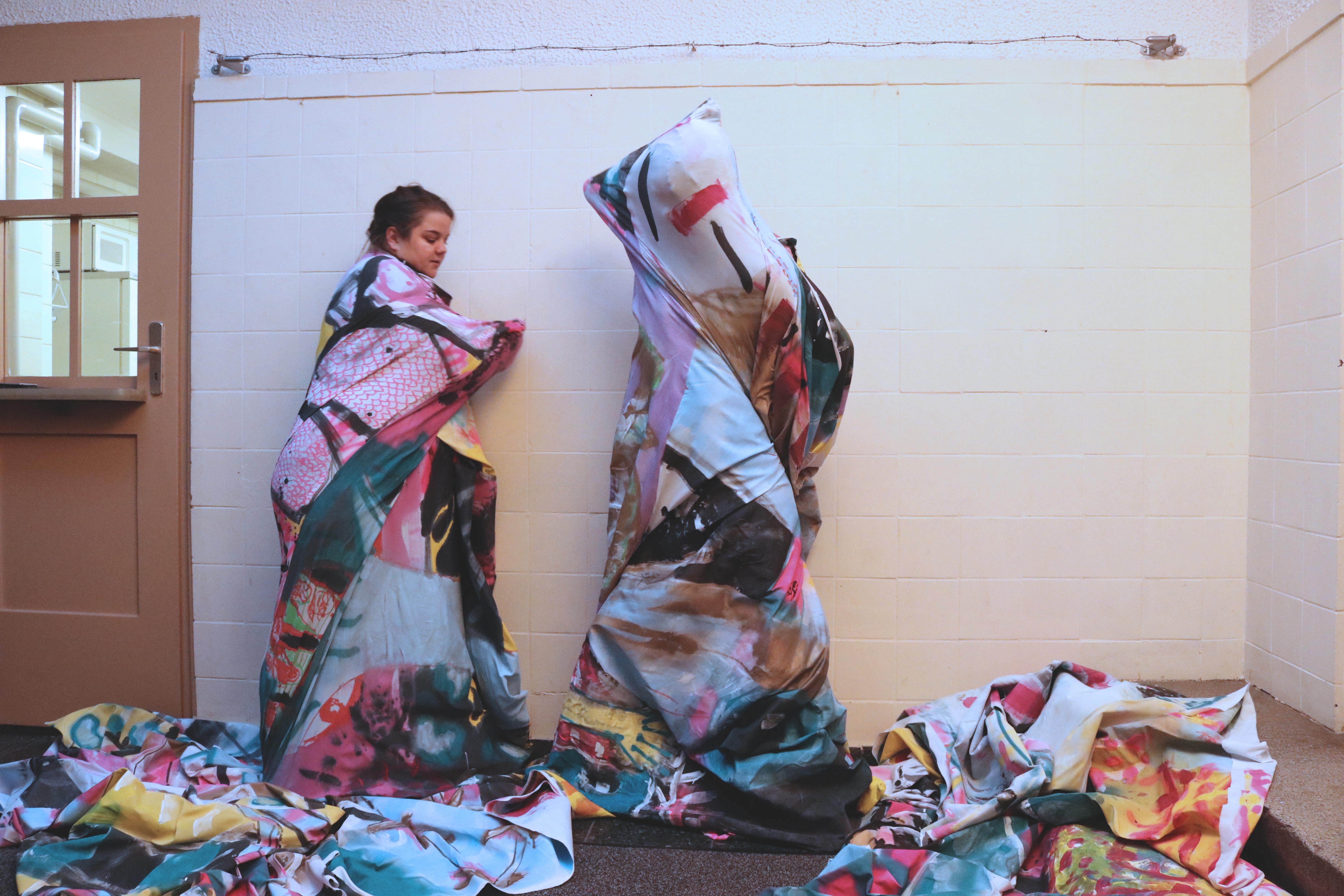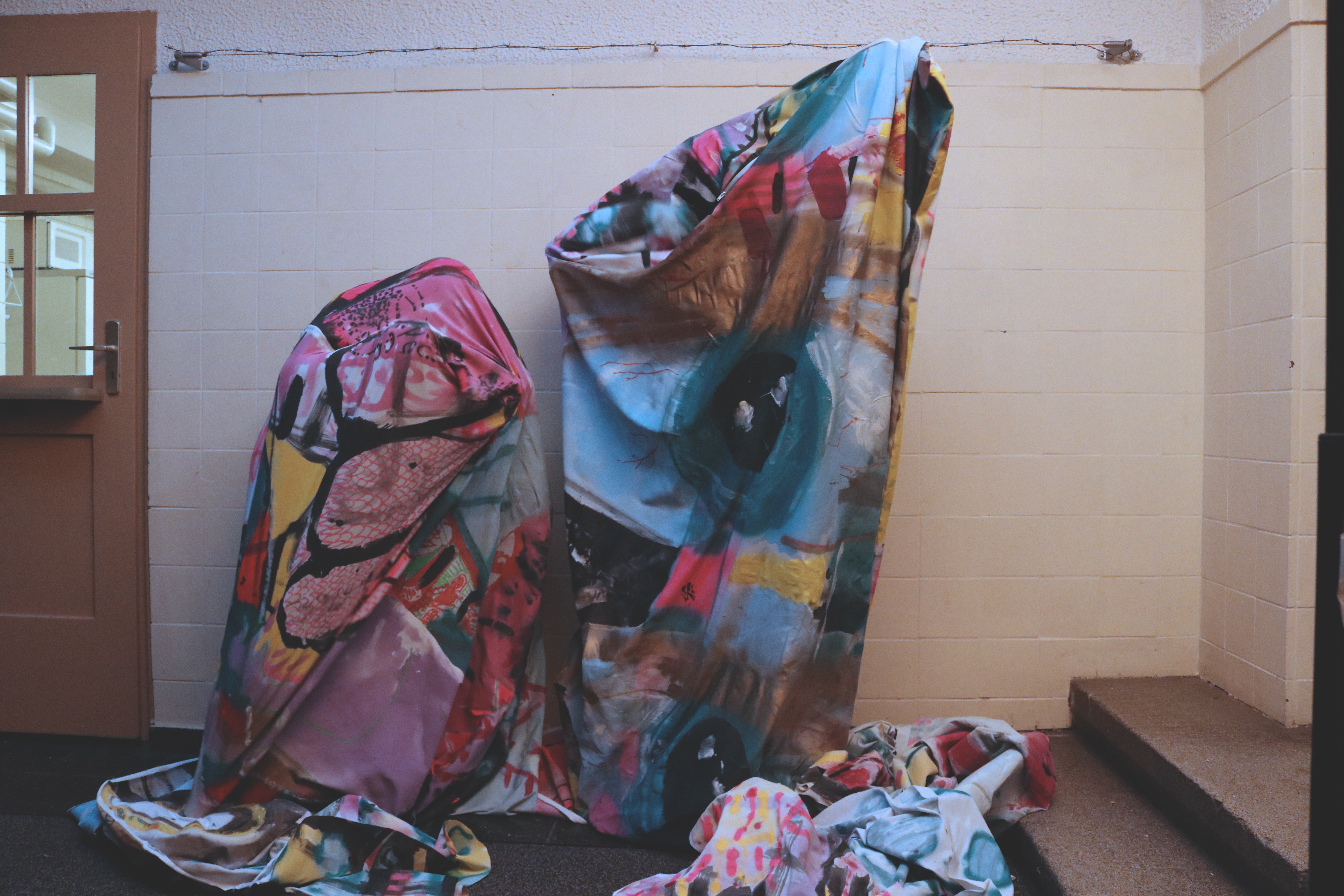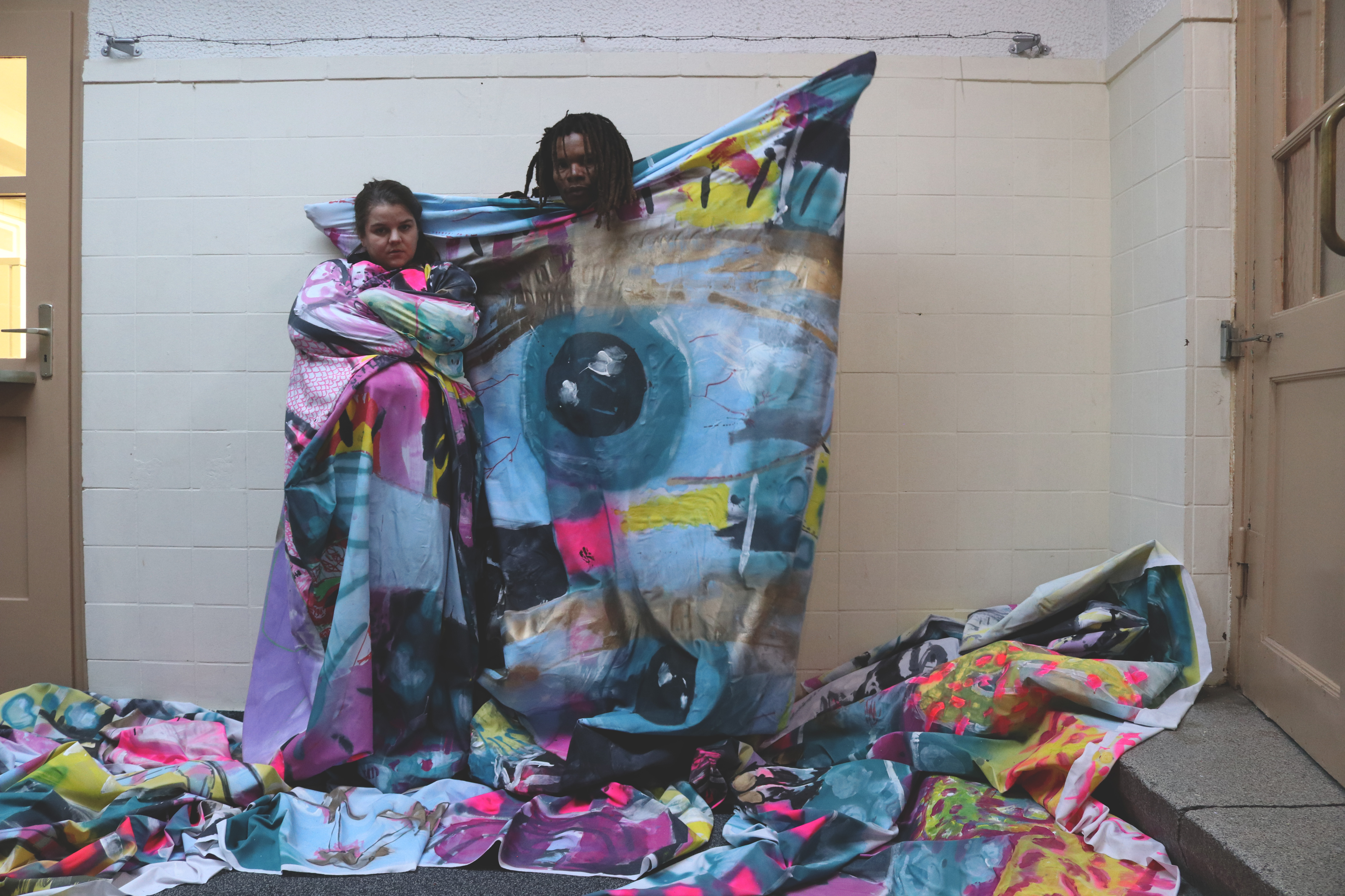 It is part of the work series „Stretching the notion of painting“, which seeks to expand the understanding of painting. The predominant, Eurocentric media logic of conservation, recording and archiving is countered by a performative, situational approach to the material. Performers are invited to change the paintings through (body) movement and transform them into dynamic, dialogical, three-dimensional elements. The result is a moving sculpture that shifts and is deformed by external influences. The sculpture is also a visualisation of perspectives that can be relativised, the distortions of identities through the foreign gaze and the construction of alterity.