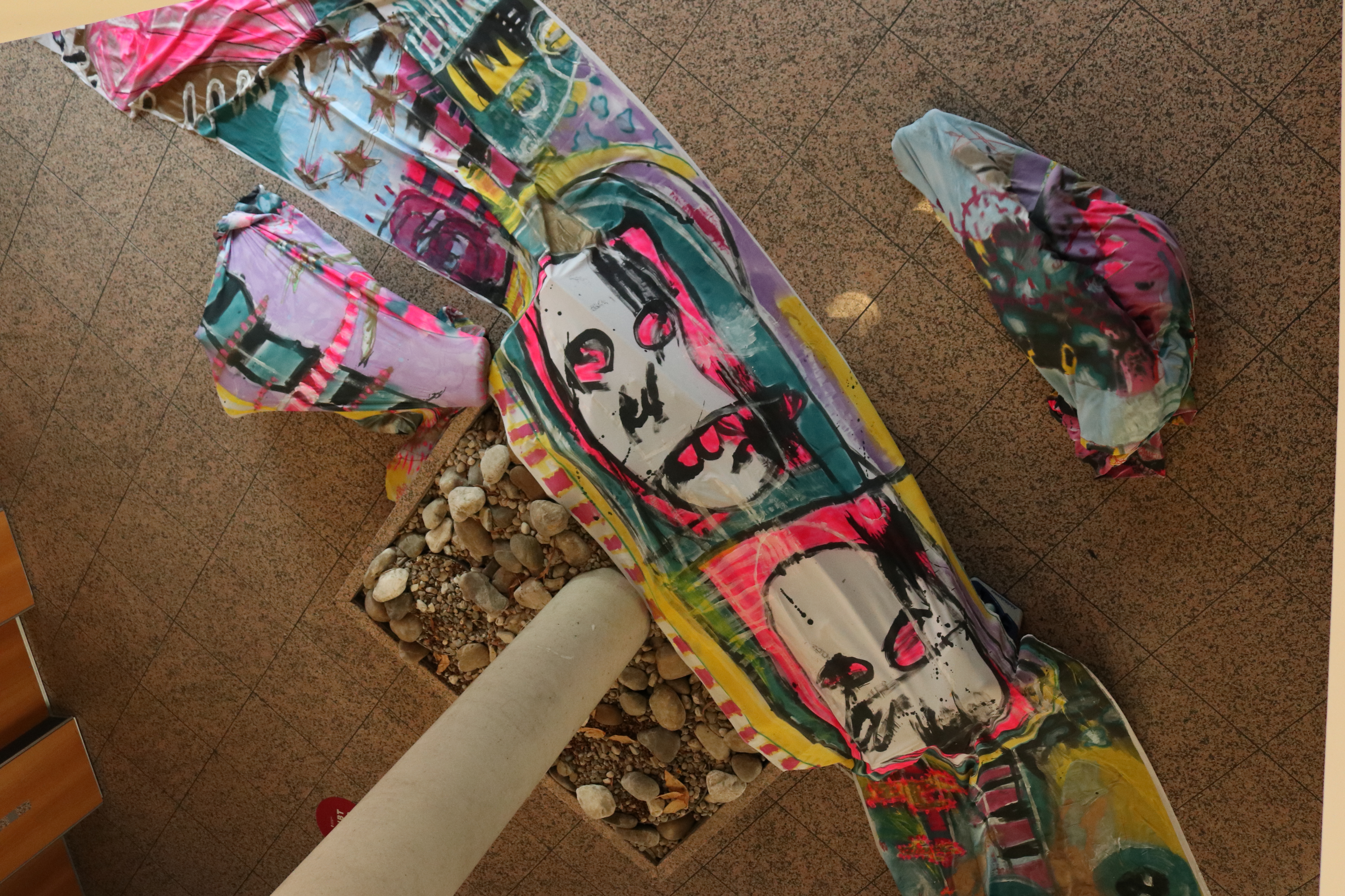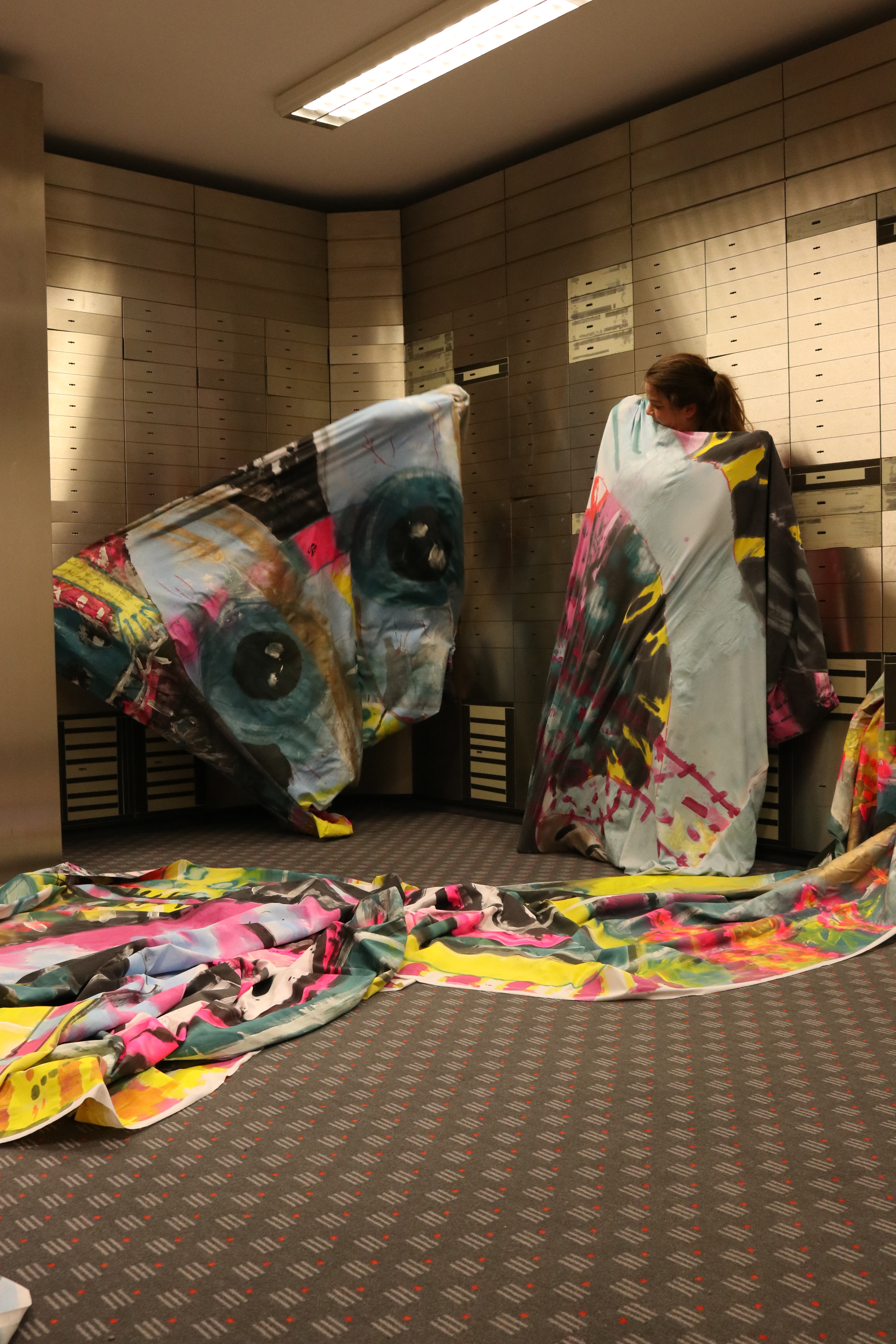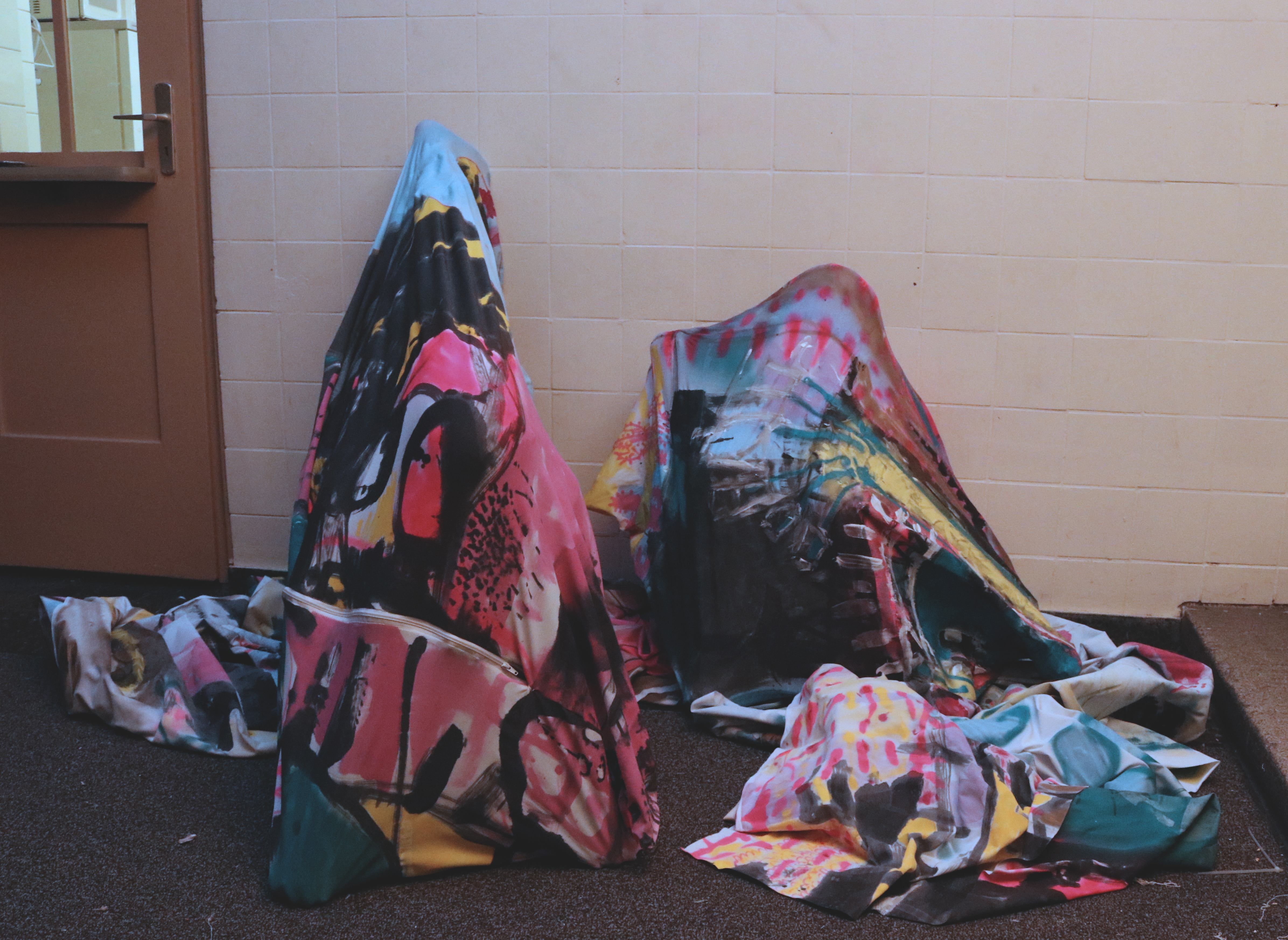 It is part of the work series „Stretching the notion of painting“, which seeks to expand the understanding of painting. The predominant, Eurocentric media logic of conservation, recording and archiving is countered by a performative, situational approach to the material. Performers are invited to change the paintings through (body) movement and transform them into dynamic, dialogical, three-dimensional elements. The result is a moving sculpture that shifts and is deformed by external influences. The sculpture is also a visualisation of perspectives that can be relativised, the distortions of identities through the foreign gaze and the construction of alterity.