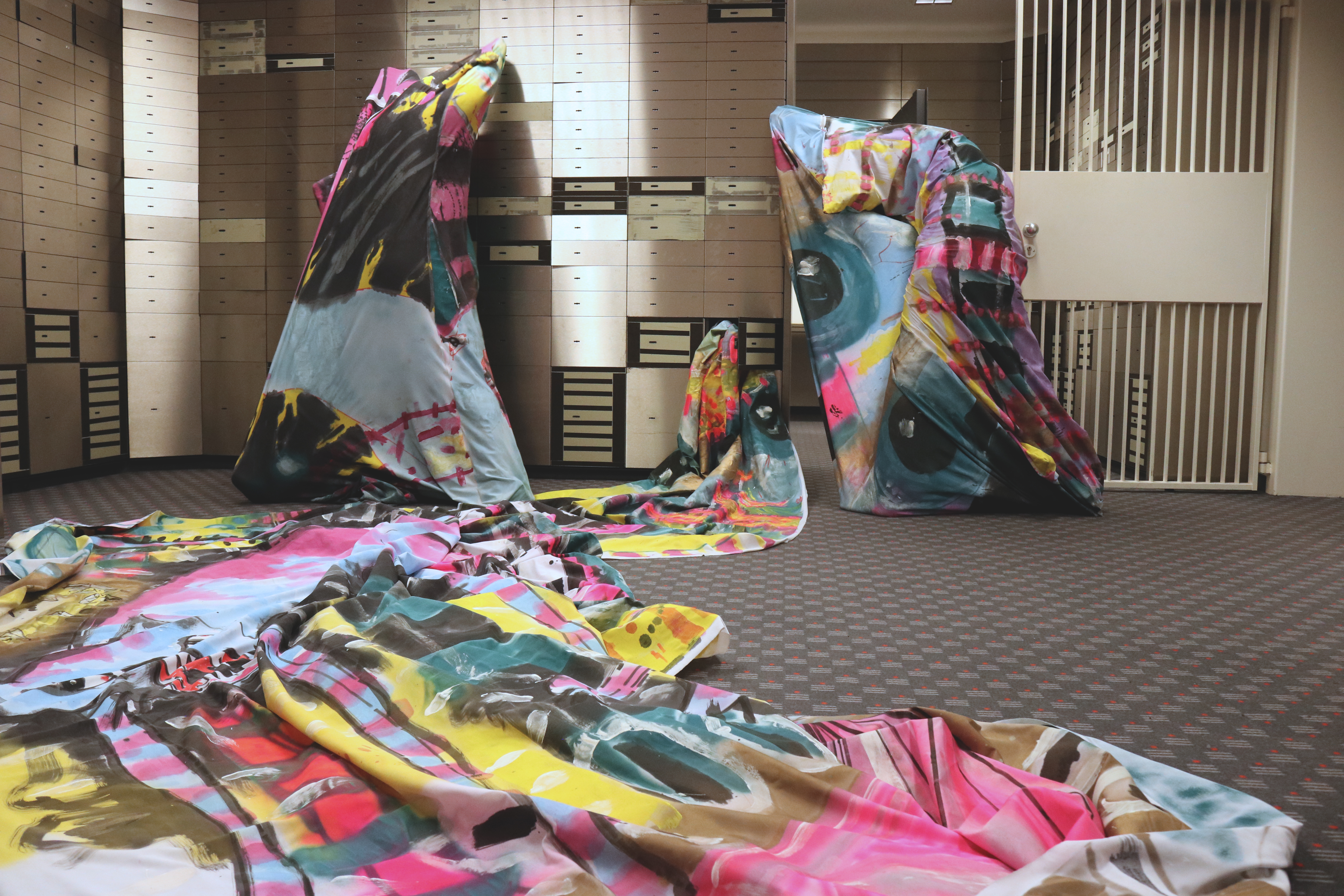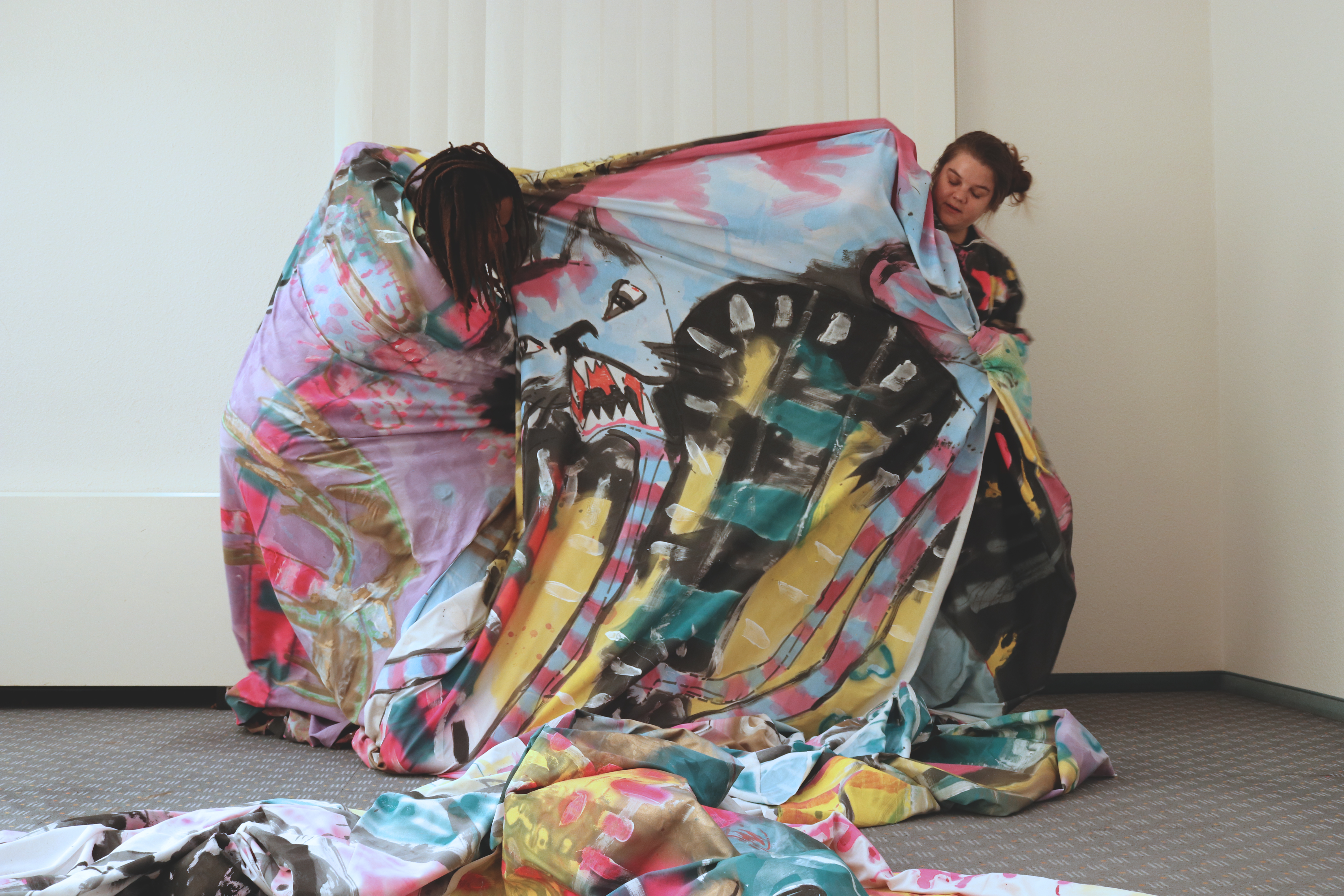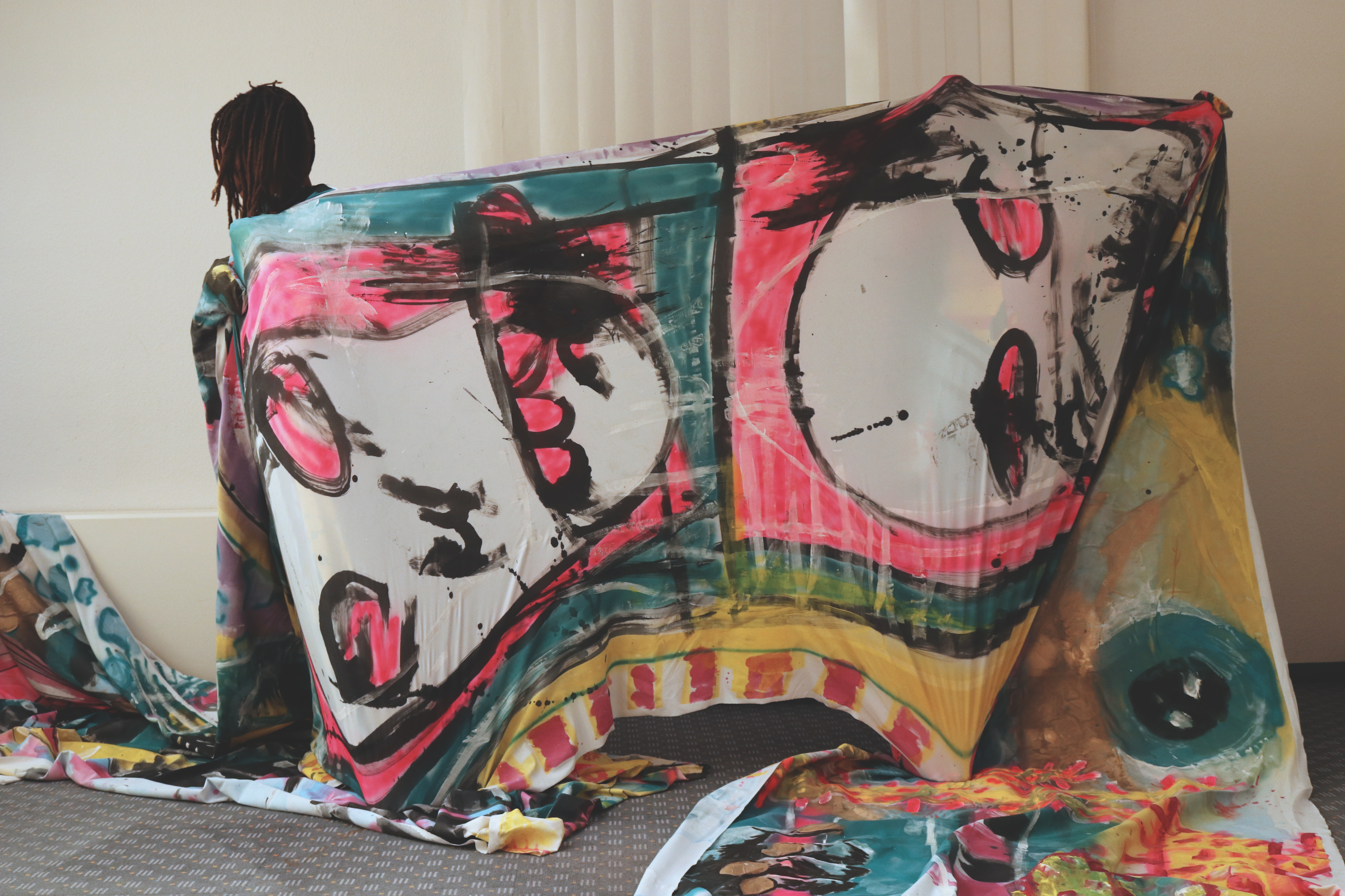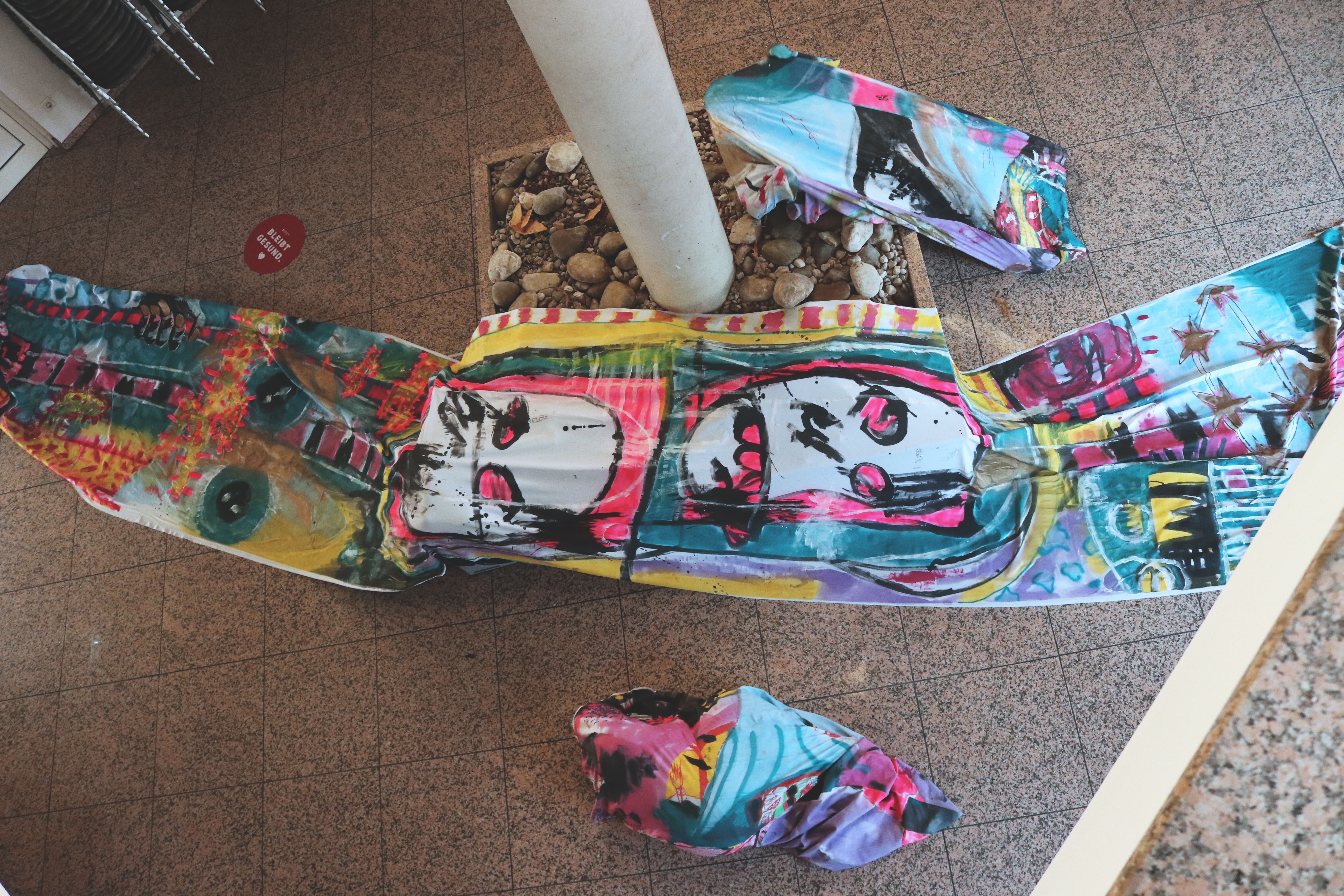 It is part of the work series „Stretching the notion of painting“, which seeks to expand the understanding of painting. The predominant, Eurocentric media logic of conservation, recording and archiving is countered by a performative, situational approach to the material. Performers are invited to change the paintings through (body) movement and transform them into dynamic, dialogical, three-dimensional elements. The result is a moving sculpture that shifts and is deformed by external influences. The sculpture is also a visualisation of perspectives that can be relativised, the distortions of identities through the foreign gaze and the construction of alterity.